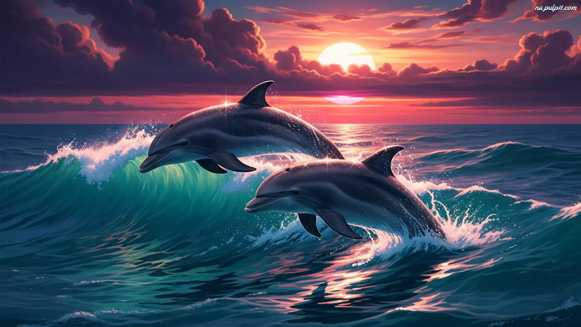 Grafika, Dwa, Fala, Zachód słońca, Chmury, Morze, Delfiny Na Pulpit