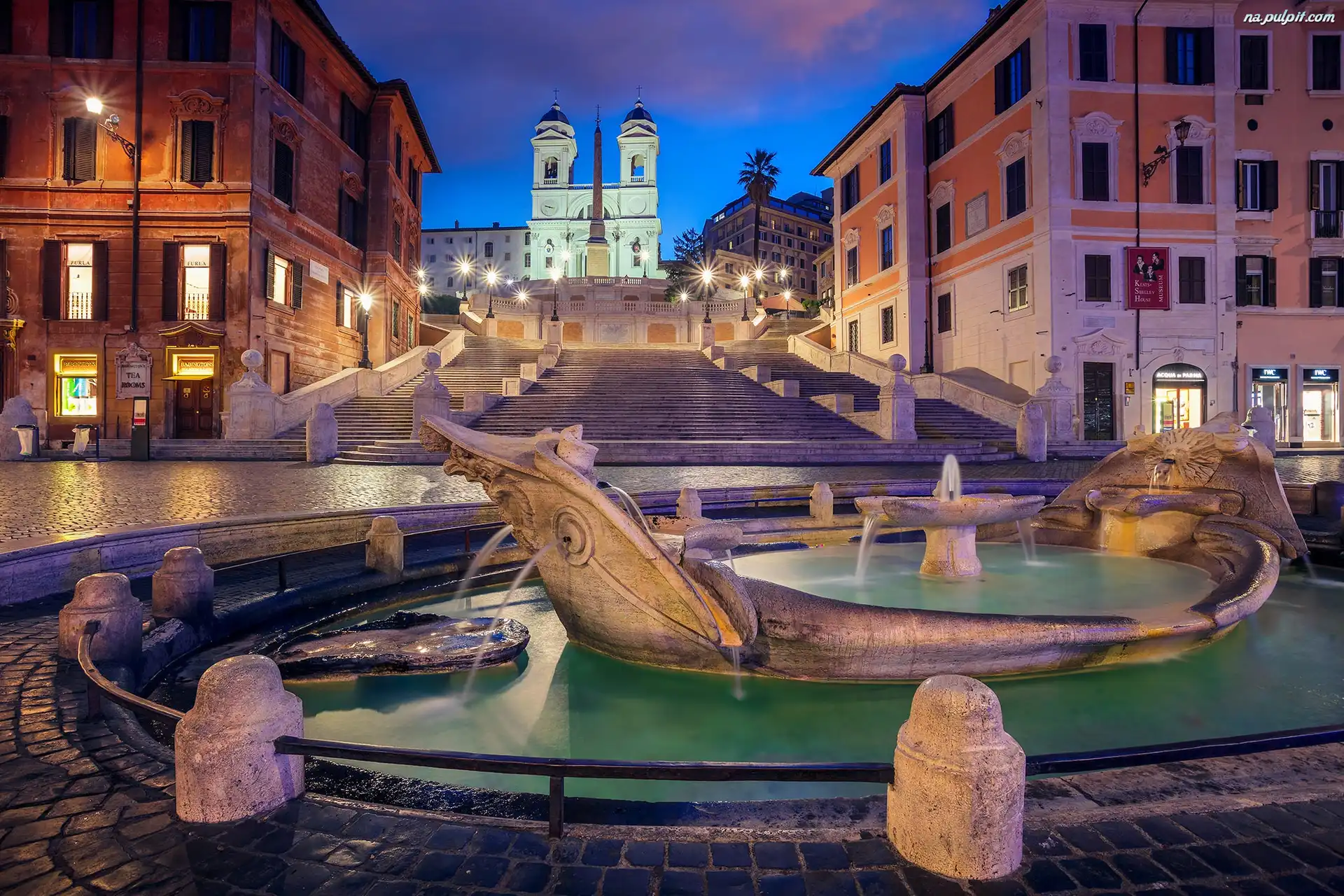 Światła, Rzym, Noc, Schody Hiszpańskie, Plac Piazza di Spagna - Plac Hiszpański, Włochy, Fontana della Barcaccia Na Pulpit |