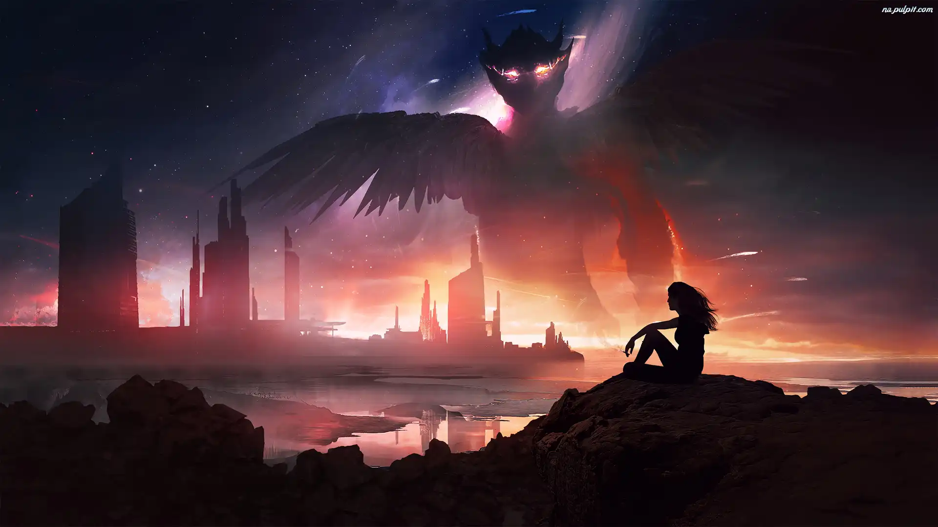 Demon, Wzgórze, Kobieta, Potwór, Fantasy, Miasto