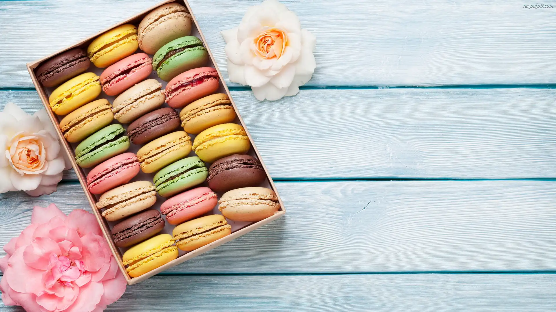 Deski, Pudełko, Makaroniki, Ciasteczka, Róże