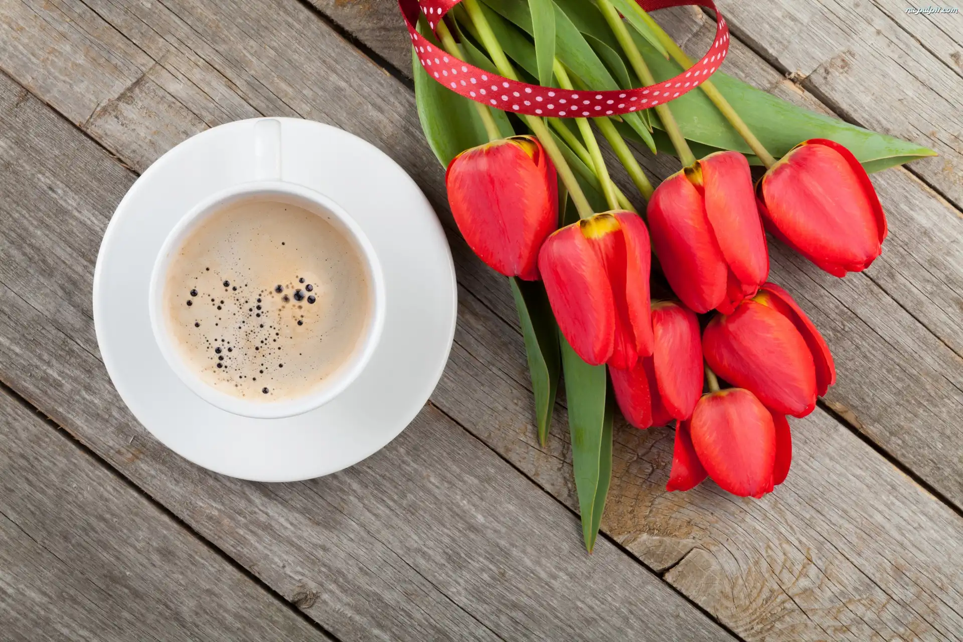 Deski, Czerwone, Filiżanka, Kawa, Tulipany Na Pulpit