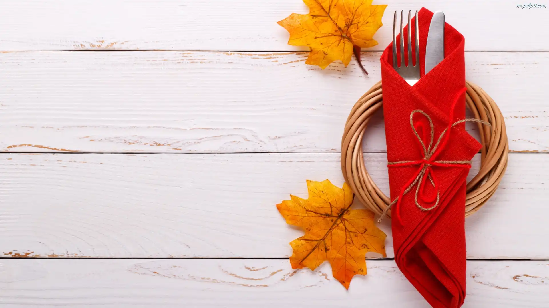 Deski, Czerwona, Sztućce, Liście, Serwetka