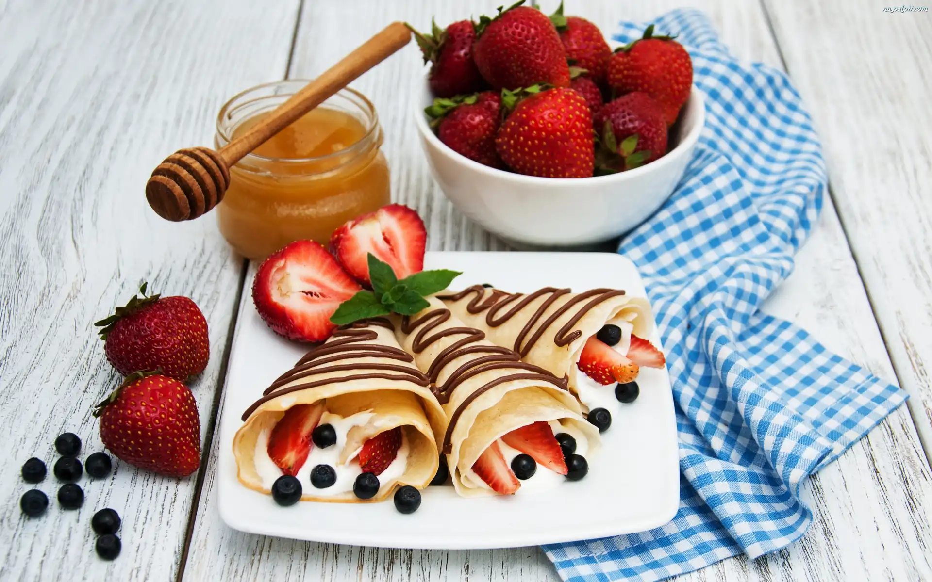 Deski, Truskawki, Naleśniki, Miód