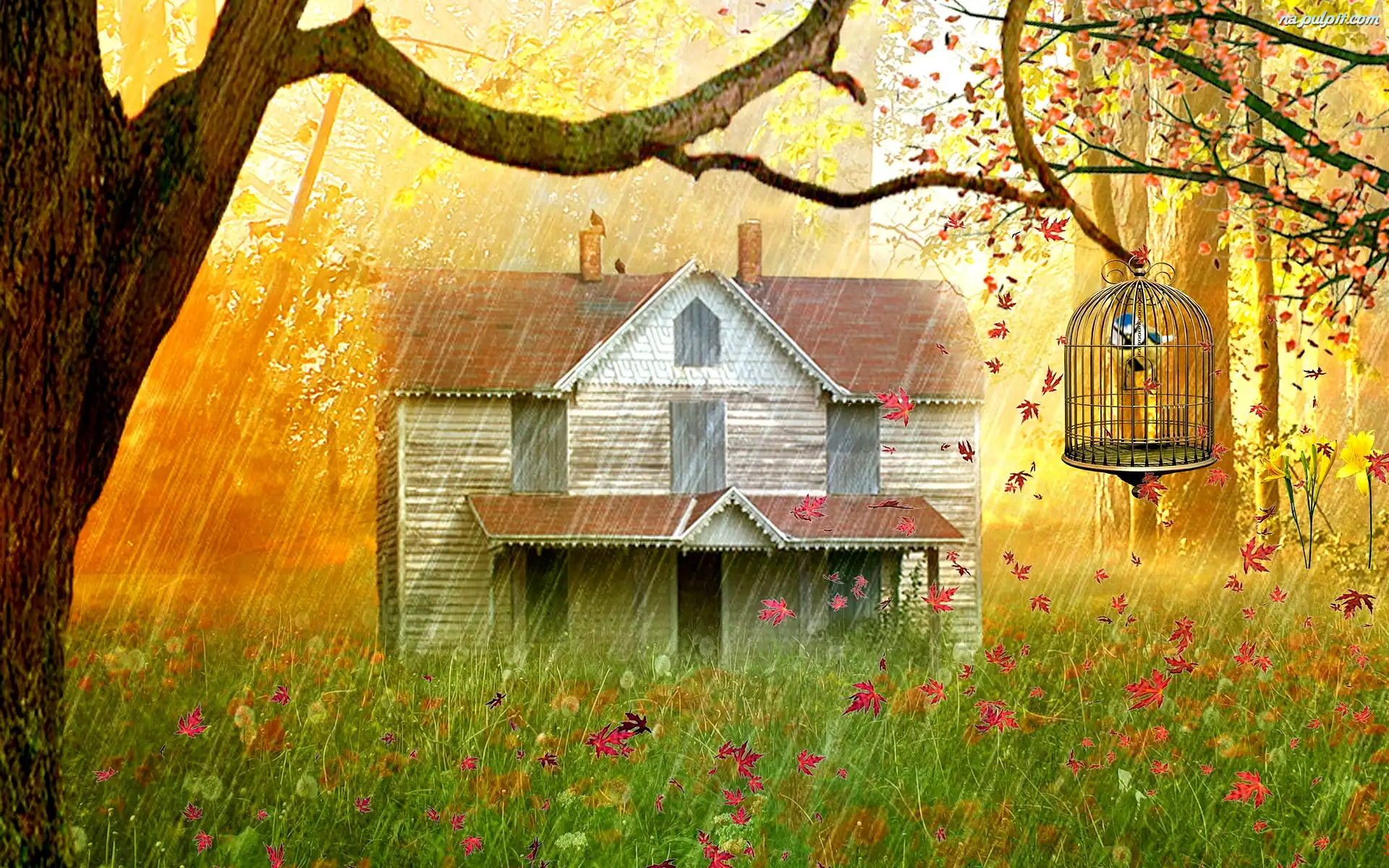 Deszcz, Trawa, Drzewa, Domek, Liście Na Pulpit