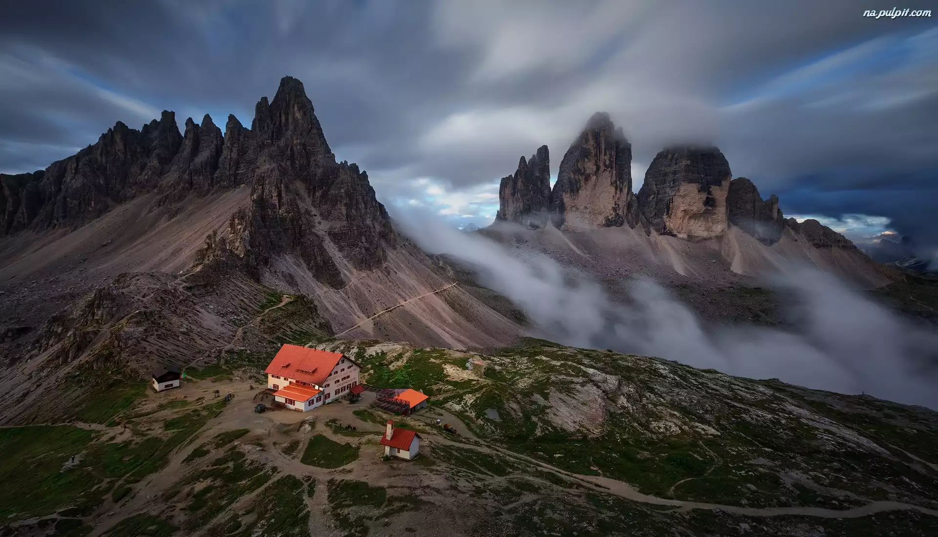 Szczyty Tre Cime di Lavaredo, Chmury, Góry, Domy, Chmury, Dolomity, Włochy, Schronisko, Zmierzch Na Pulpit |