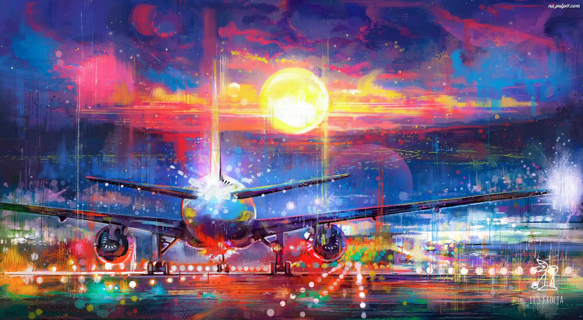 Pas startowy, Grafika, Digital art, Słońce, Samolot