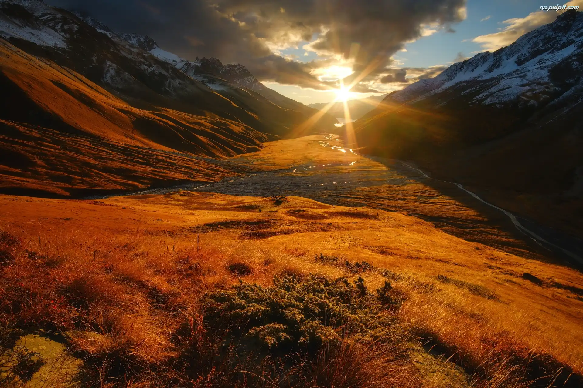 Digoria, Góry, Kaukaz, Promienie słońca, Osetia Północna, Rosja, Świt, Bagno Chefandzar, Rzeka Urukh Na Pulpit |