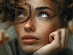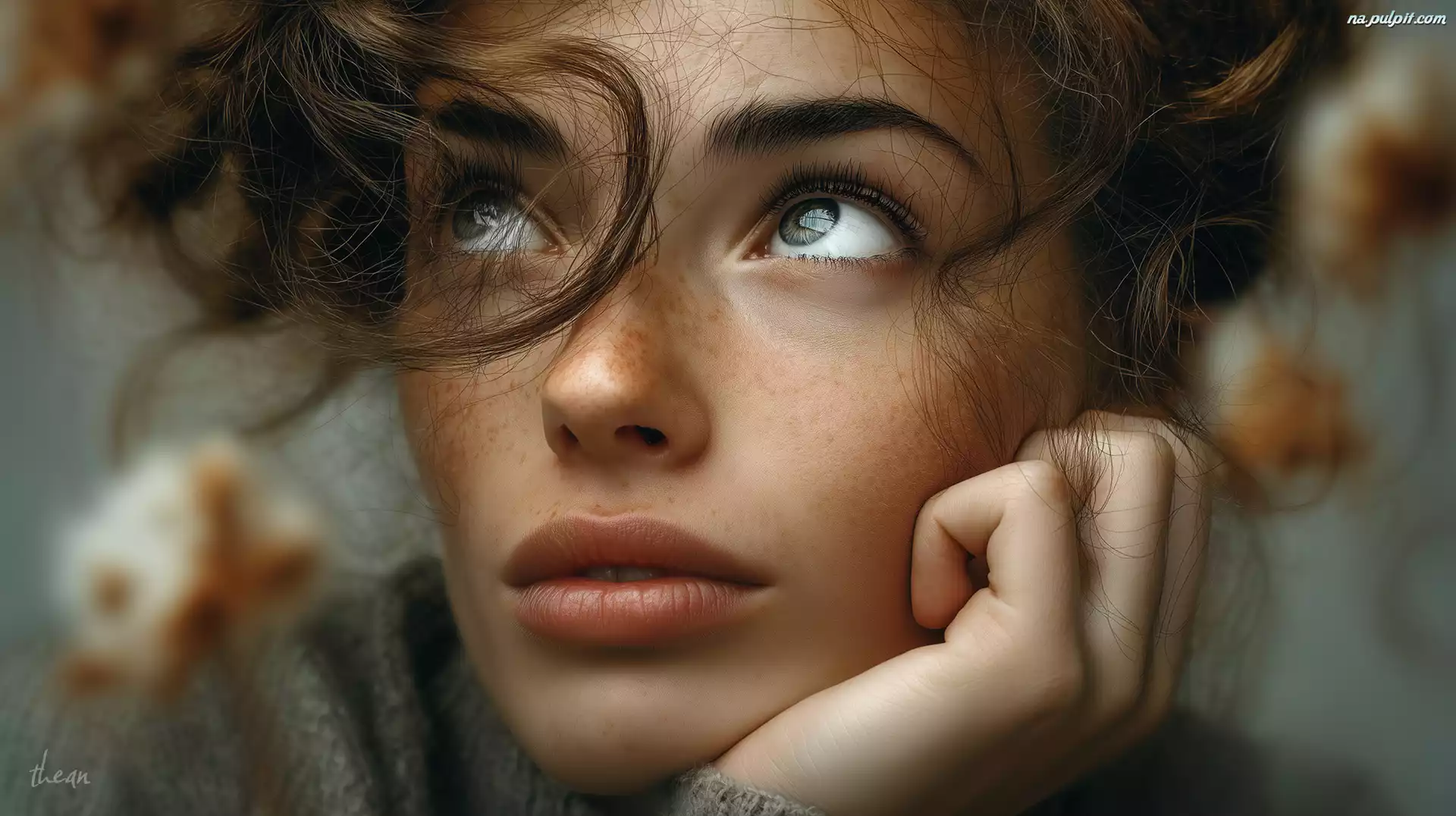 Grafika AI, Loki, Piegi, Kobieta, Szatynka, Twarz, Dłoń Na Pulpit