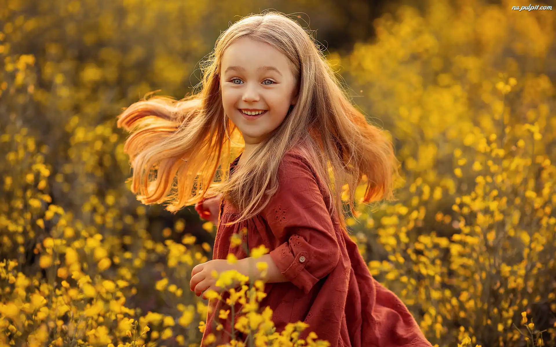 Lato, Długie, Włosy, Łąka, Kwiaty, Uśmiech, Dziewczynka, Blondynka Na Pulpit