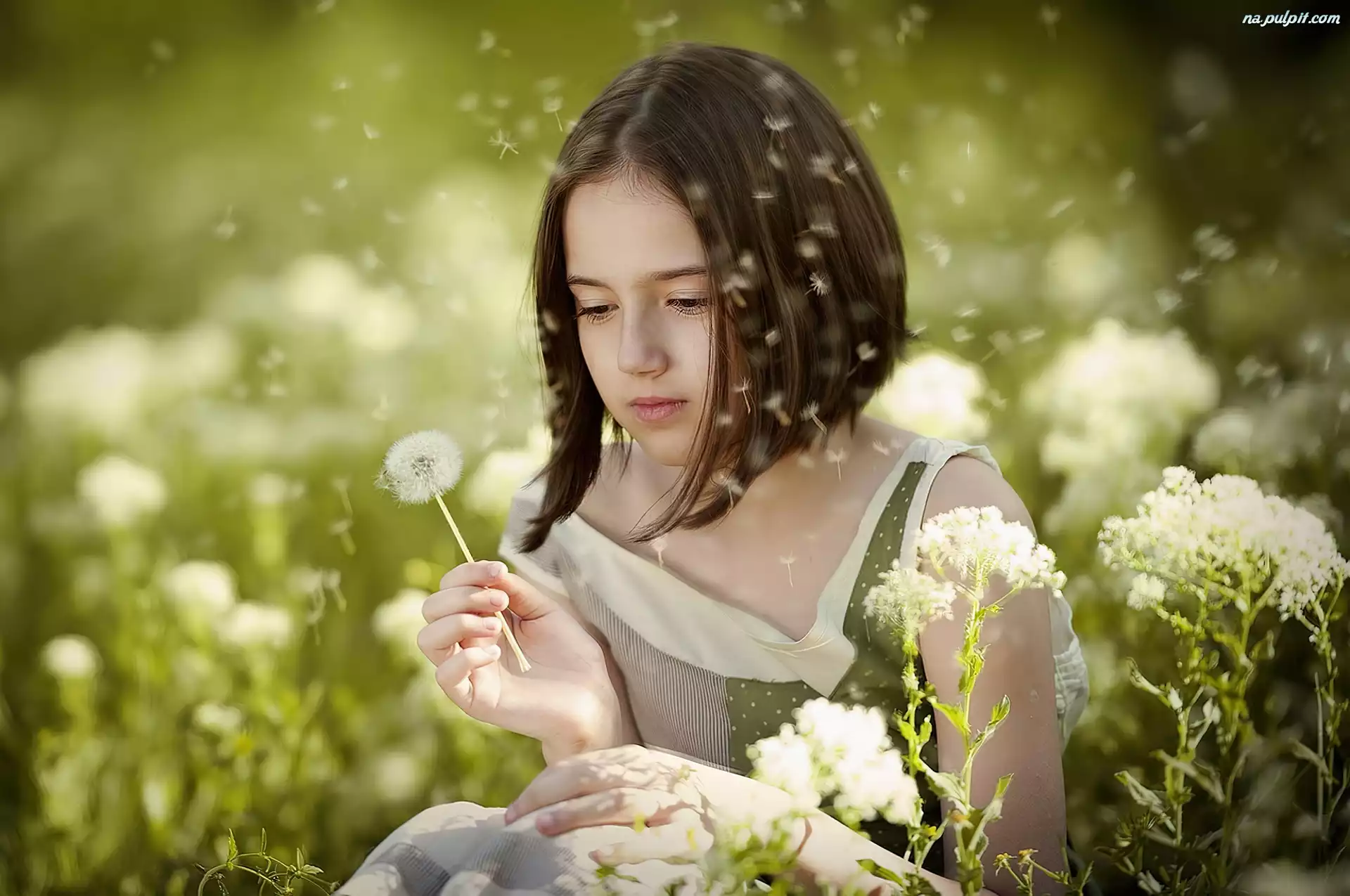 Dmuchawce, Łąka, Dziewczyna, Kwiaty