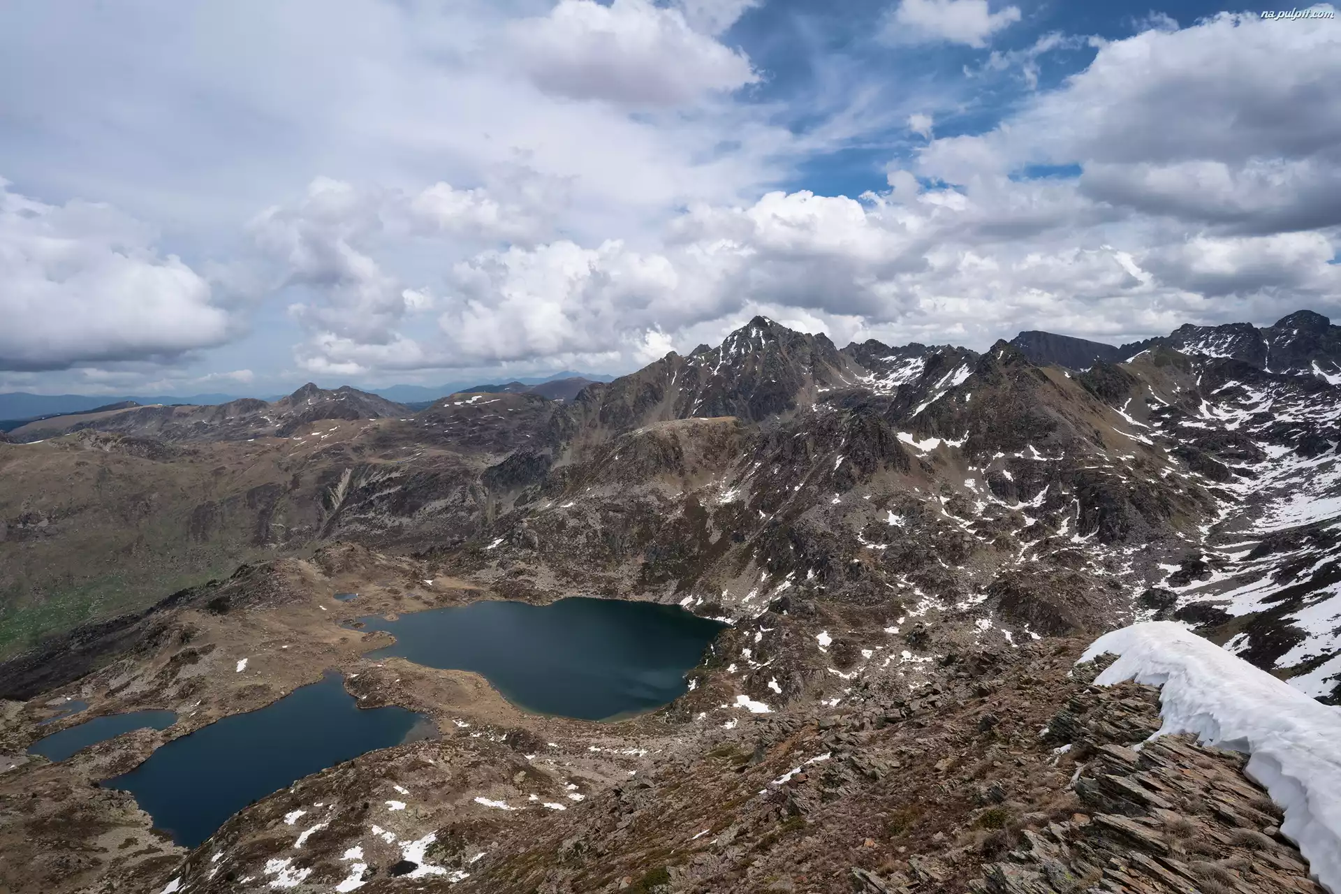 Góry, Jeziora, Pireneje, Francja, Niebo, Śnieg, Dolina Aston, Etangs de Fontargente Na Pulpit