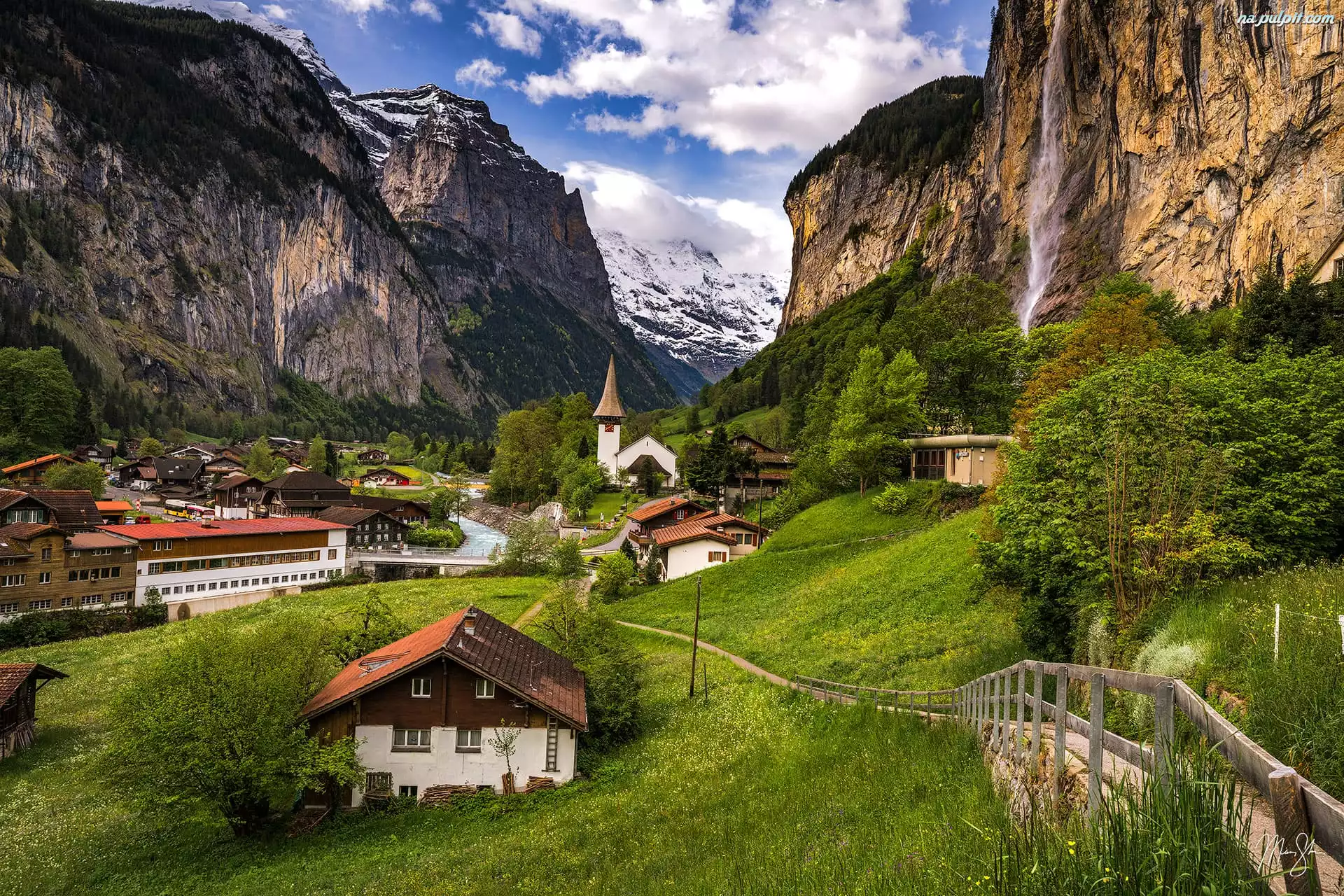 Kanton Berno, Wodospad Staubbach, Szwajcaria, Góry, Droga, Kościół, Dolina Lauterbrunnental, Domy, Drzewa, Gmina Lauterbrunnen Na Pulpit |