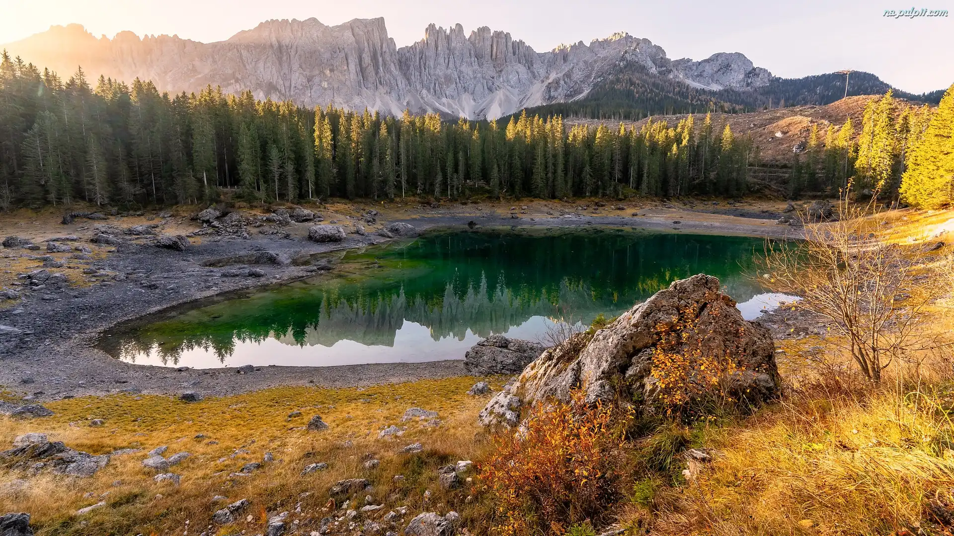 Południowy Tyrol, Włochy, Lago Karersee, Góry, Dolomity, Carezza, Jezioro, Odbicie, Drzewa Na Pulpit |