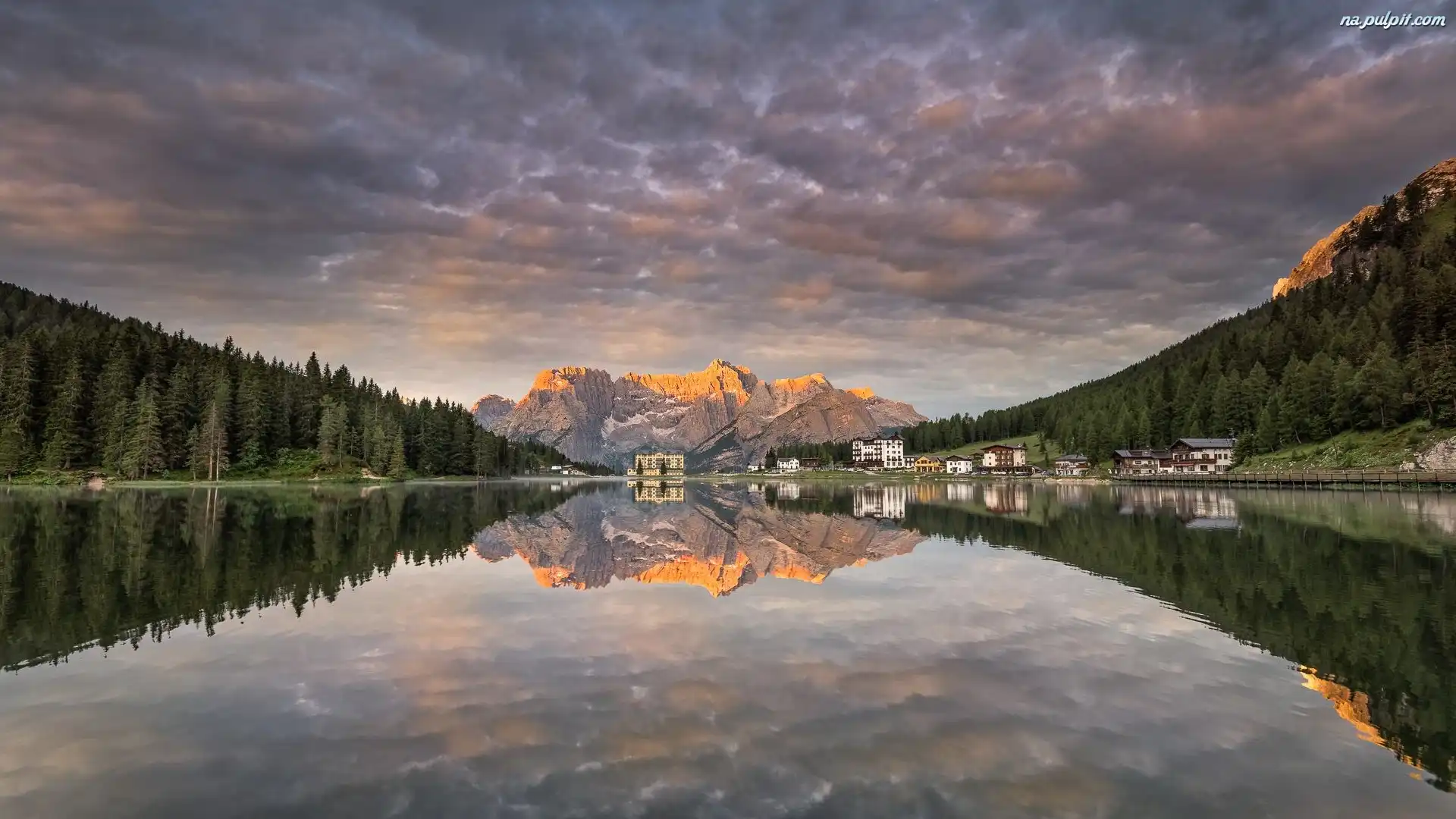 Dolomity, Grand Hotel Misurina, Misurina Lake, Jezioro, Cortina dAmpezzo, Region Cadore, Włochy, Domy, Góry, Chmury Na Pulpit |