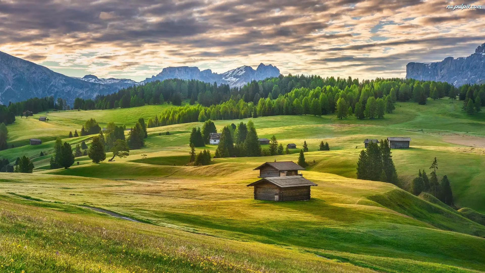 Góry Sassolungo, Domki, Płaskowyż, Dolomity, Drzewa, Chmury, Włochy, Seiser Alm, Dolina Val Gardena, Łąki Na Pulpit |