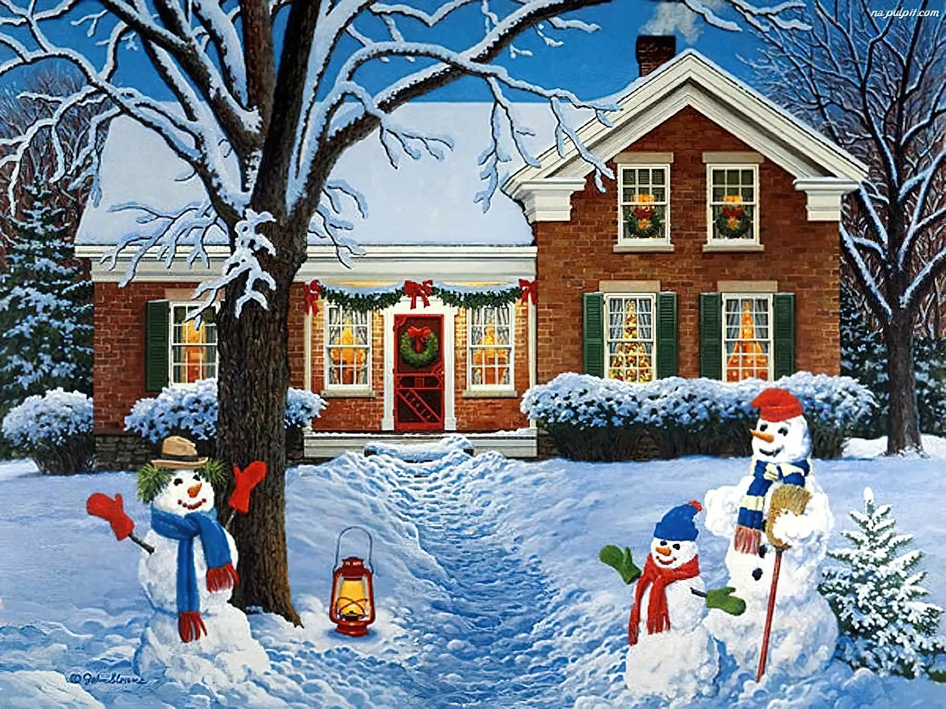 Dom, Narodzenie, Malarstwo, Zima, Bałwany, Boże Na Pulpit