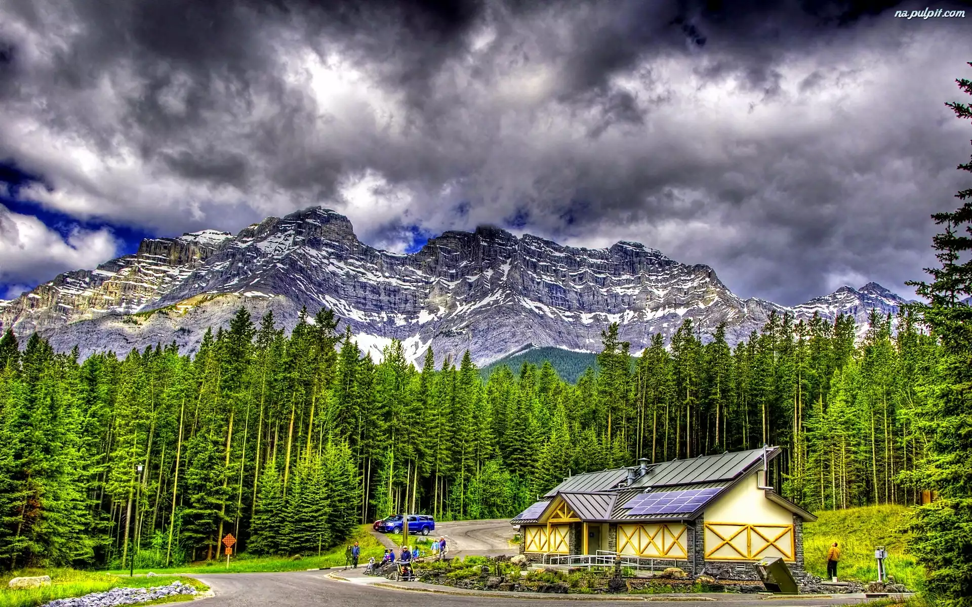 Droga, Park Narodowy Banff, Góry, Dom, Chmury, Szczyt Mount Rundle, Kanada, Las Na Pulpit