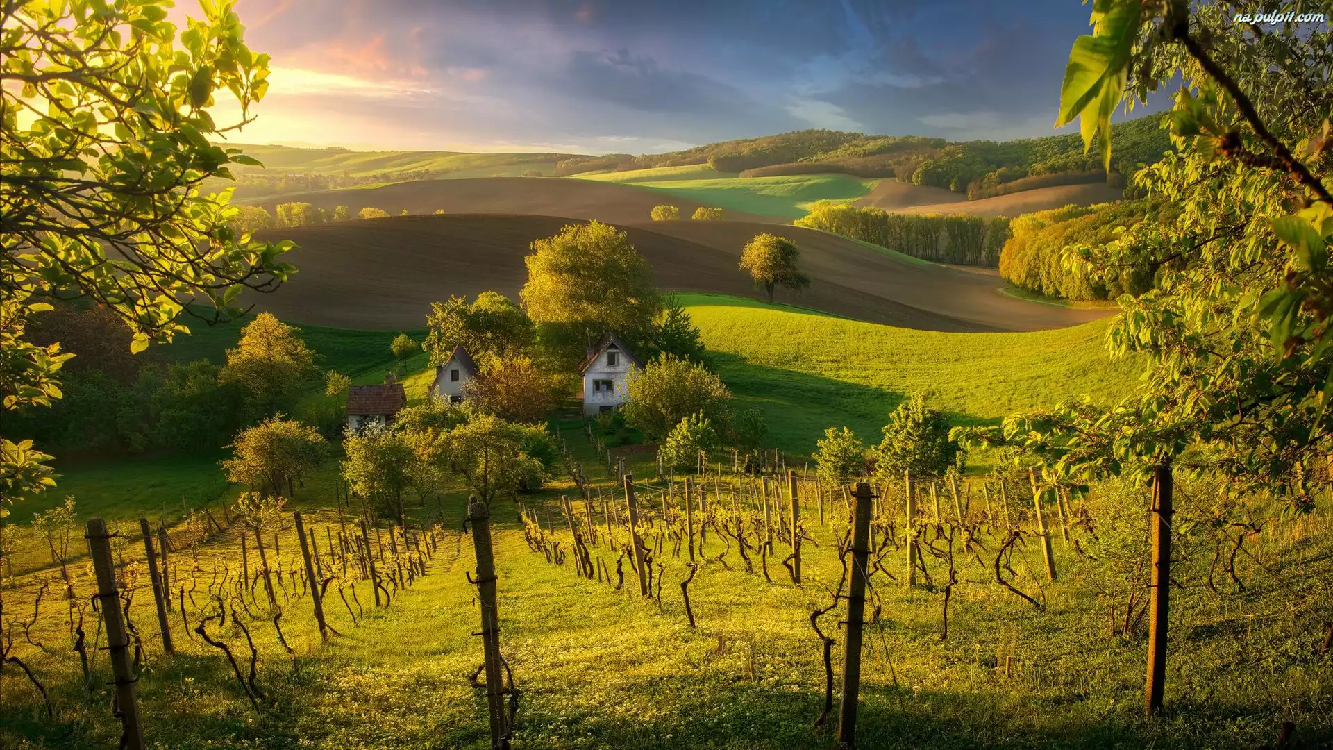 Słoneczny blask, Drzewa, Pola, Słowacja, Wzgórza, Winnice, Dom Na Pulpit