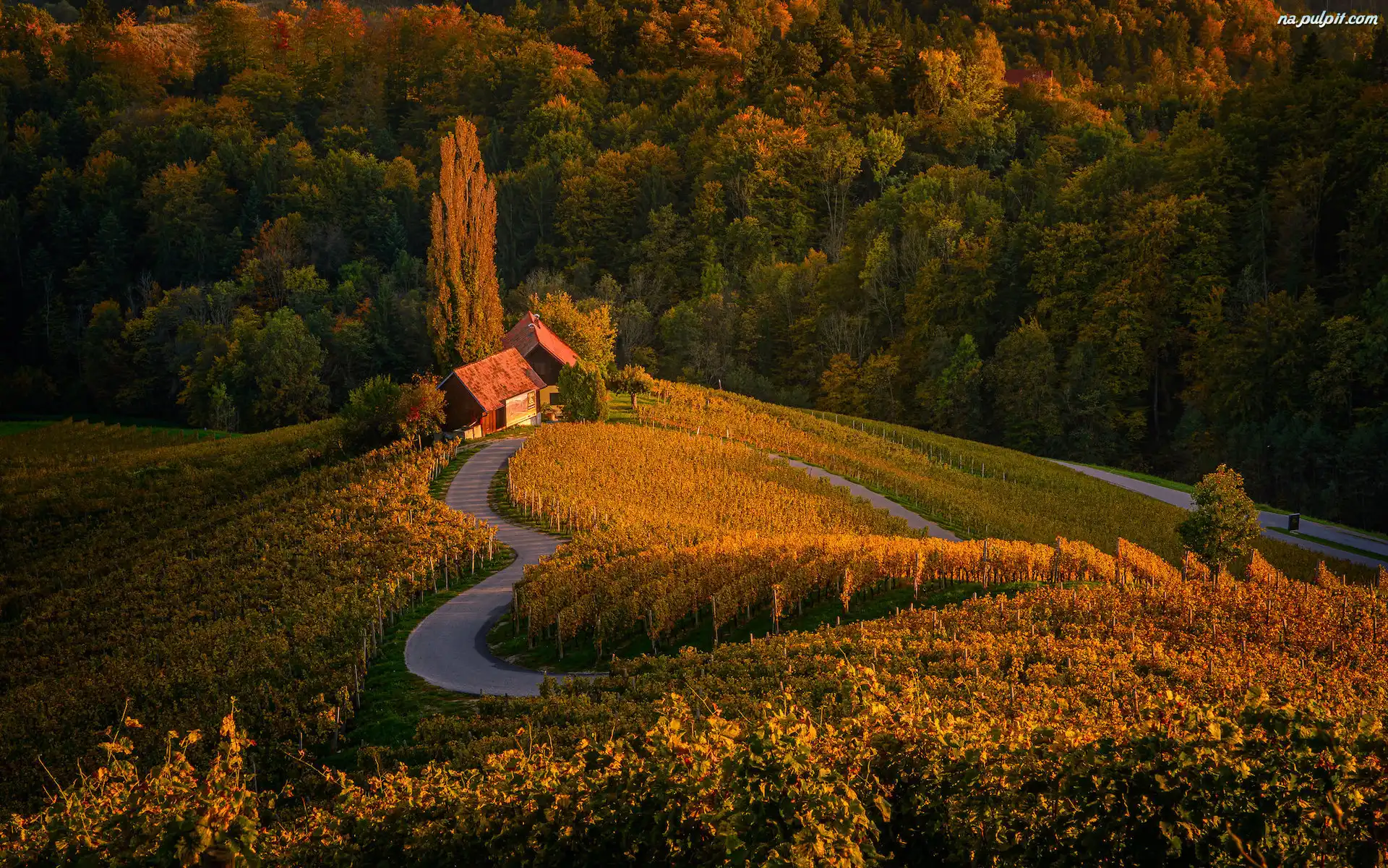 Drzewa, Las, Wieś Spicnik, Dom, Pole, Plantacja, Droga, Gmina Kungota, Słowenia, Winnica, Jesień, Serce Na Pulpit |