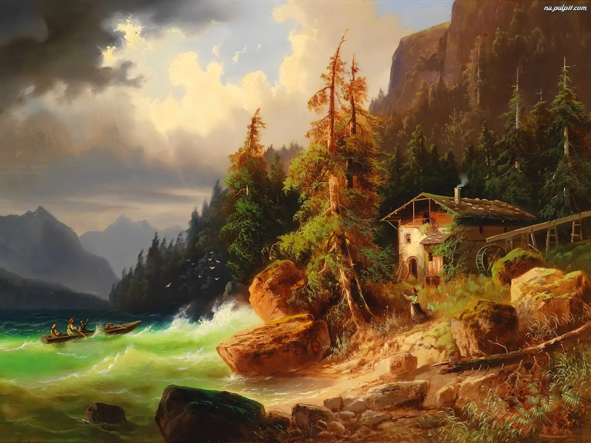 Postać, Las, Zima, Śnieg Las, śnieg Góry, Jezioro Jesień, Las Ośnieżony, Las Drzewa, Zima, Las Góra Niebo, Góry, Morze Kwiaty, Las, Kolorowe Obraz, Morze, Burza, Fale Rzeka, Las, Kamienie, Mech Obrazu, Konie, Białe, Dwa, Reprodukcja Palmy, Dom, Witraże Potok, Sceneria, Zimowa, Domek