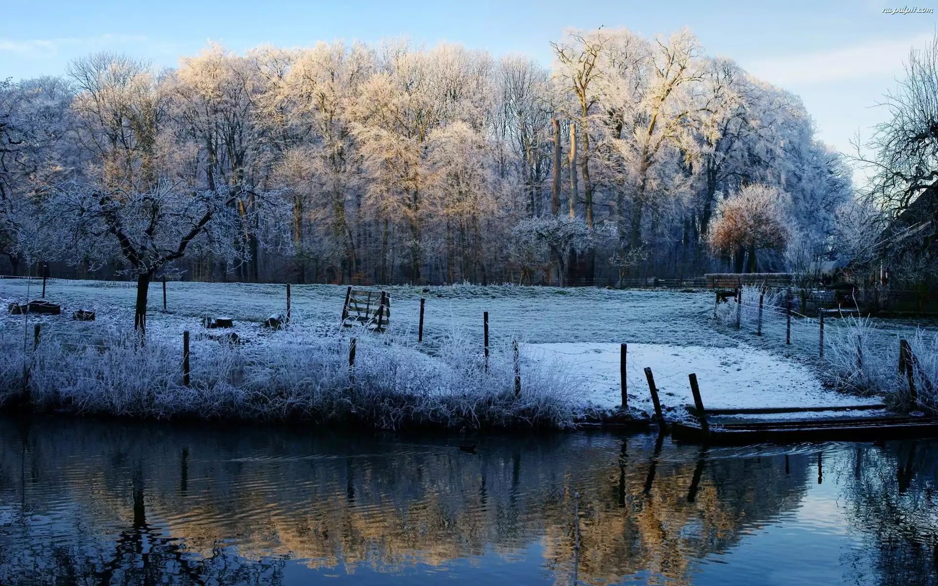 Las, Dom, Roślinność, Jeziorem, Nad, Zima, Ośnieżona