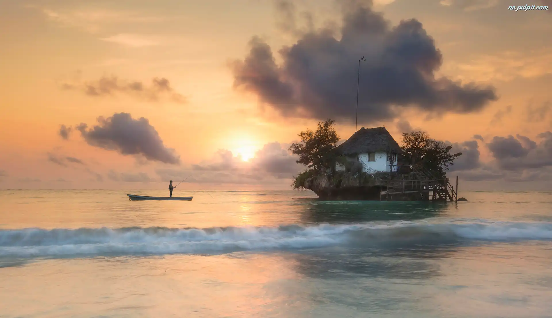 Dom, Chmury, Łódka, Wędkarz, The Rock Restaurant Zanzibar, Miejscowość Michamvi, Tanzania, Wschód słońca, Morze, Restauracja Na Pulpit |