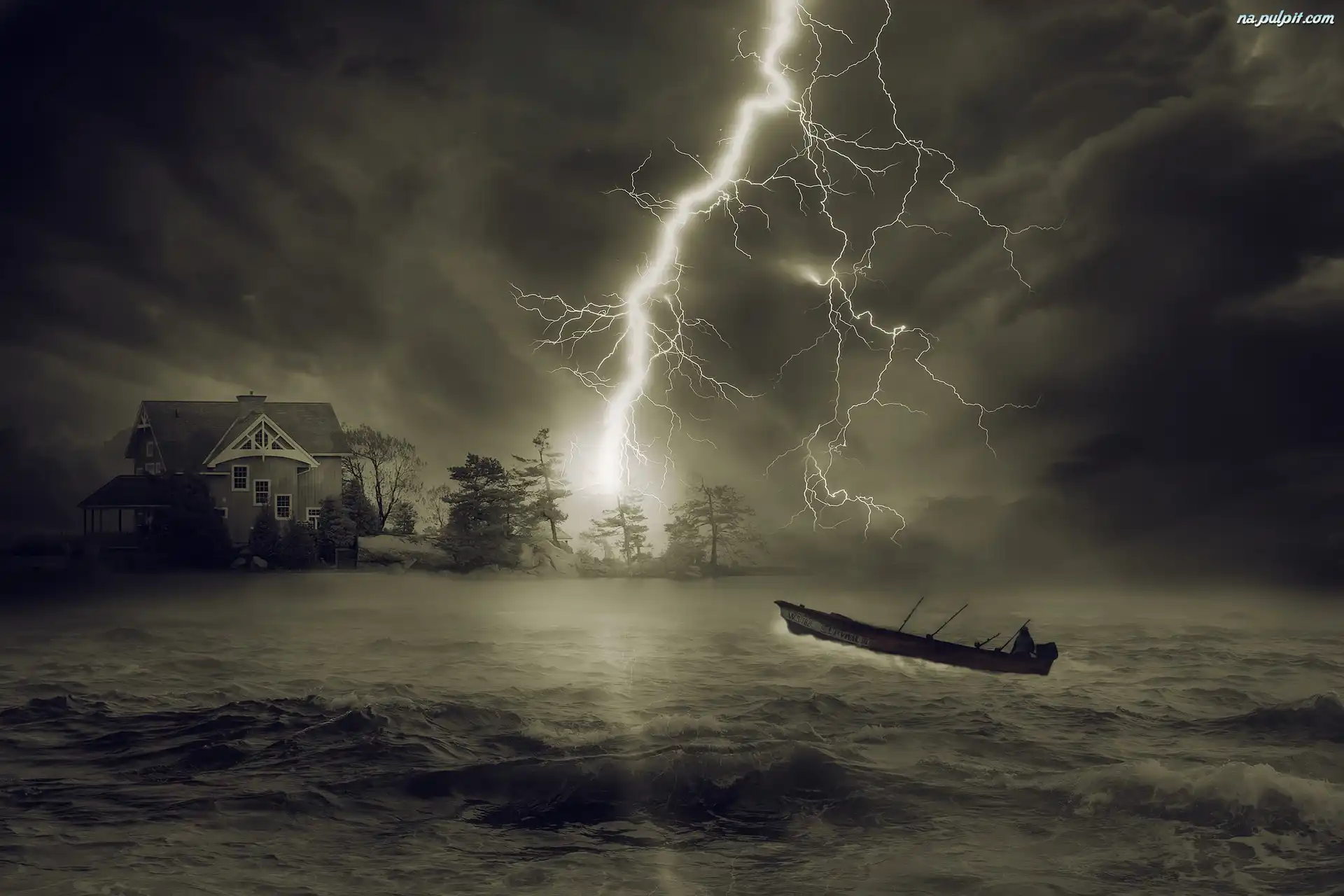 Drzewa, Pioruny, Niebo, Jezioro, Łódka, Paintography, Fale, Burza, Dom Na Pulpit