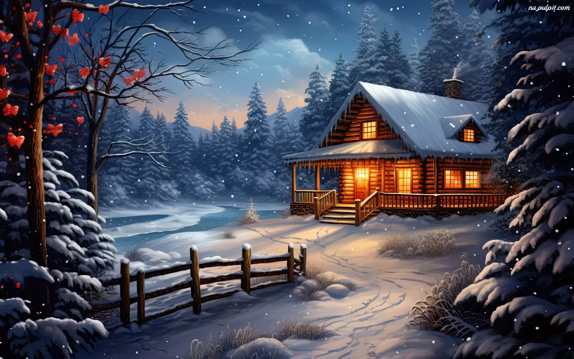 Ogrodzenie, Drzewa, Śnieg, Zima, 2D, Światła, Las, Dom Na Pulpit