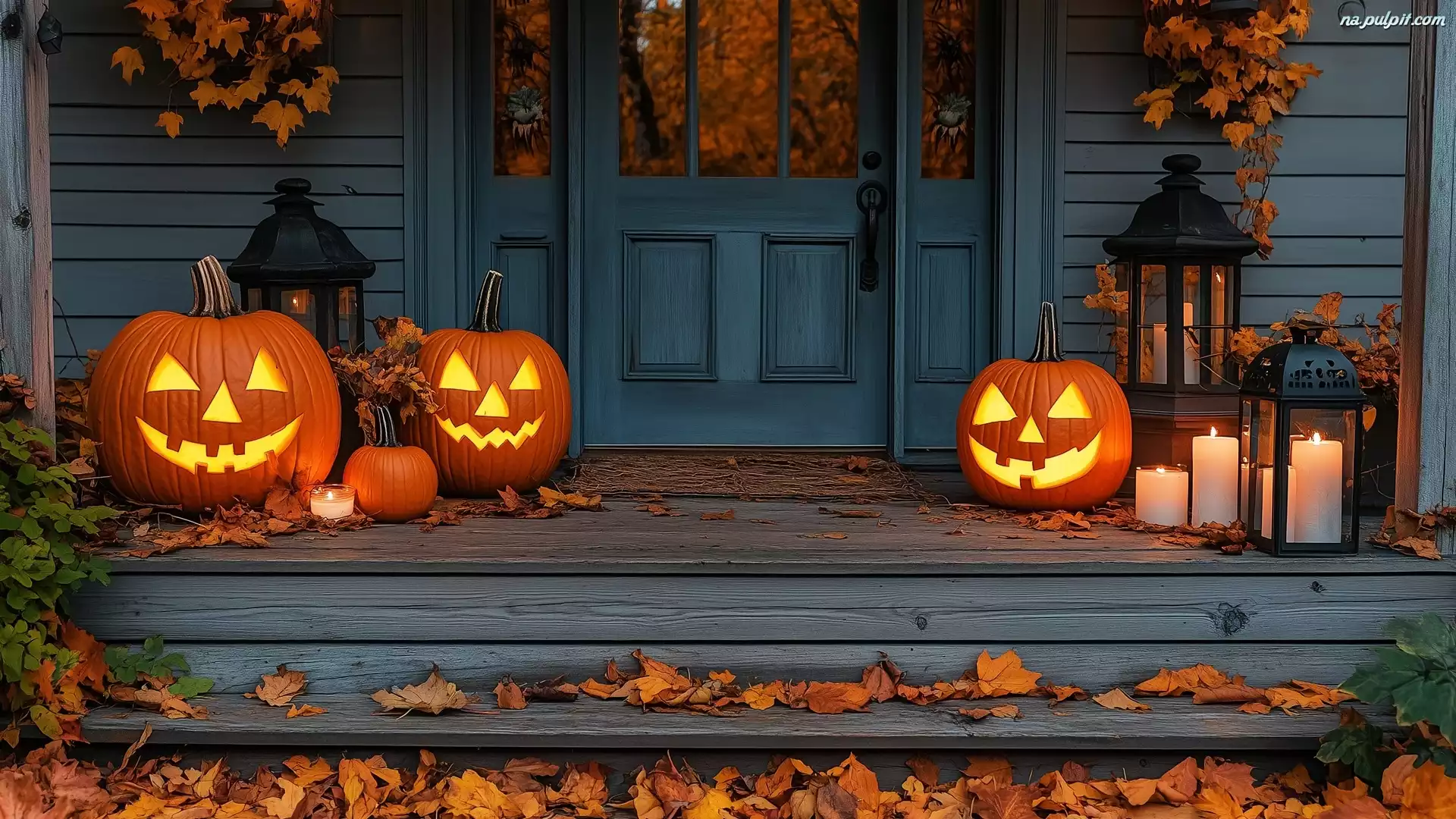 Halloween, Liście, Świece, Dom, Drzwi, Dynie, Jesień Na Pulpit