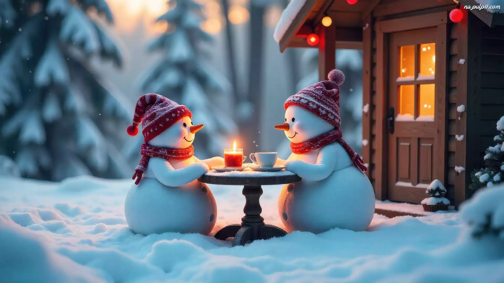 Dom, Dwa, AI, Śnieg, Czapki, Stolik, Zima, Bałwanki, Szaliki, Świeca Na Pulpit