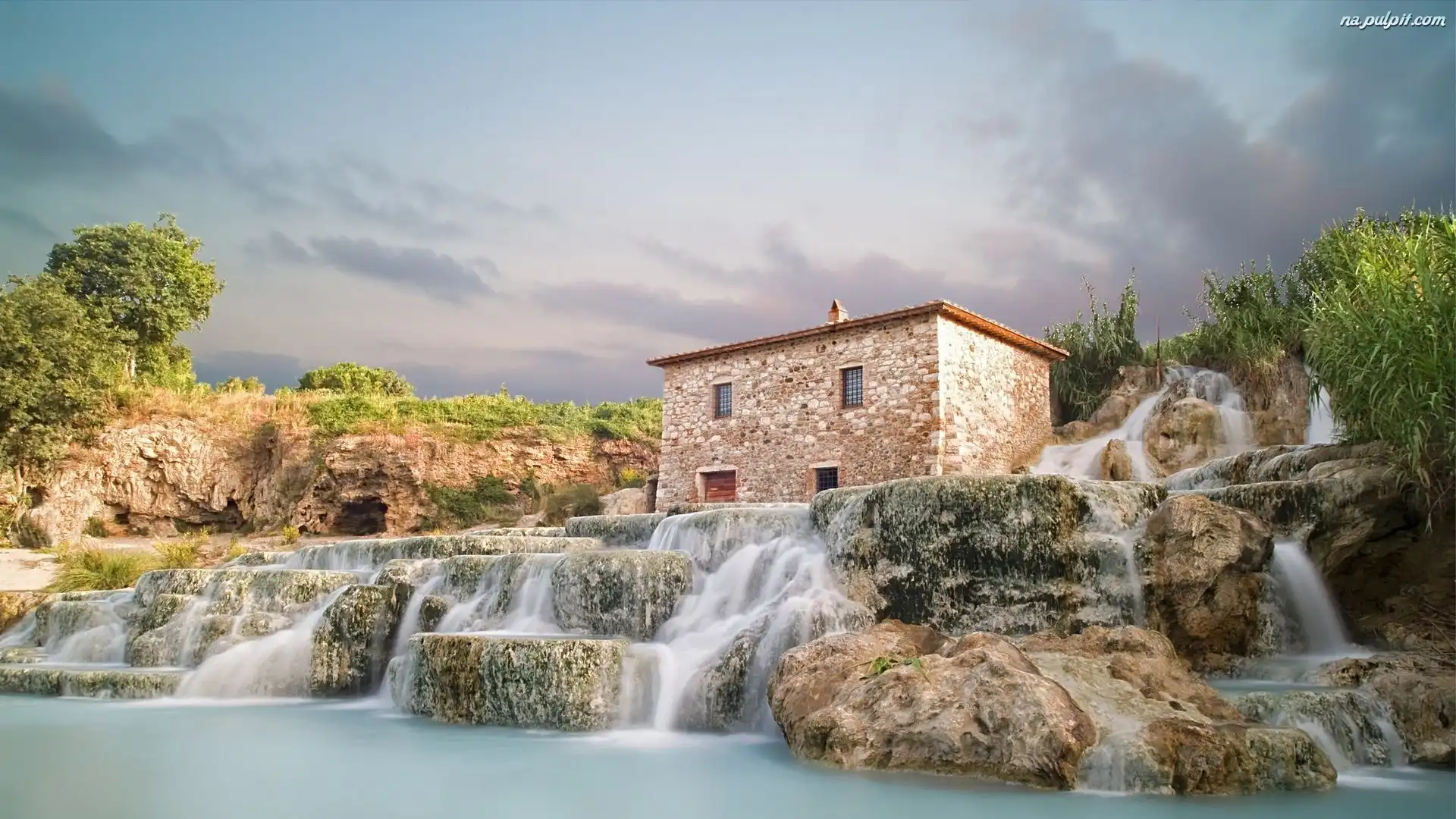 Dom, Skały, Wodospad, Drzewa Na Pulpit