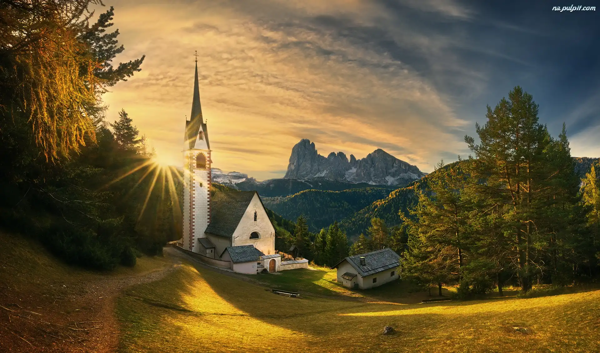 Zachód słońca, Południowy Tyrol, Dolomity, Dom, Kościół św Jakuba, Góry, Włochy, Drzewa Na Pulpit
