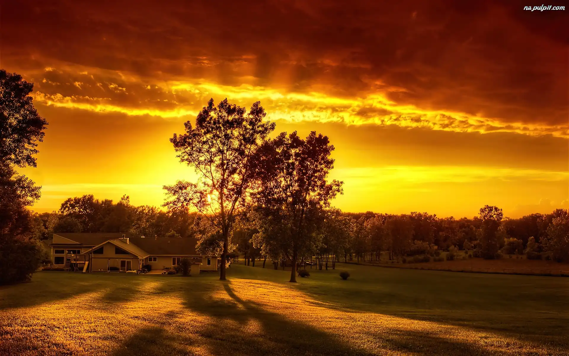 Dom, Słońca, Zachód, Drzewa Na Pulpit