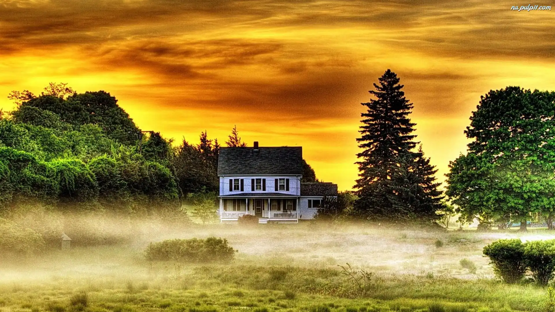 Dom, Drzewa, Słońca, Zachód, Mgła Na Pulpit