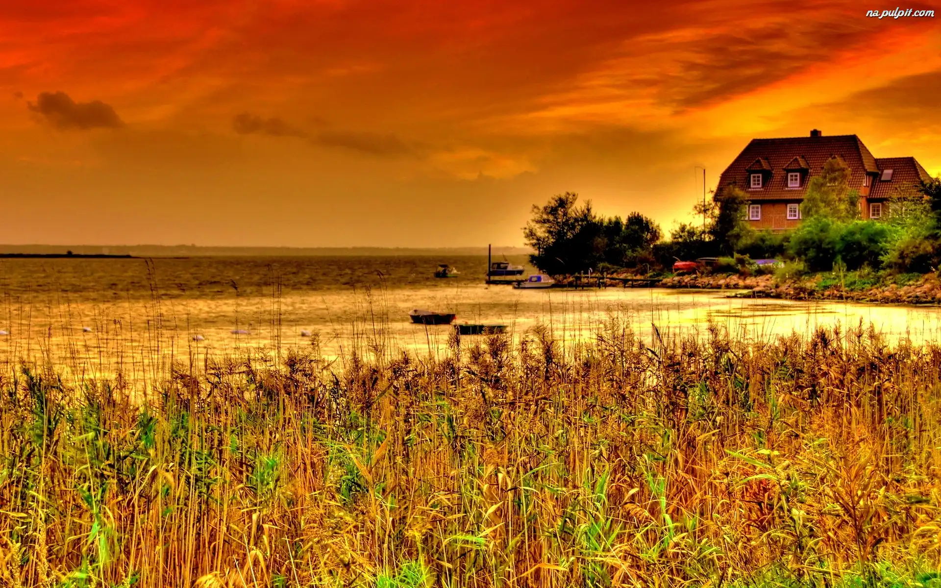 Dom, Jezioro, Słońca, Zachód, Trawa Na Pulpit