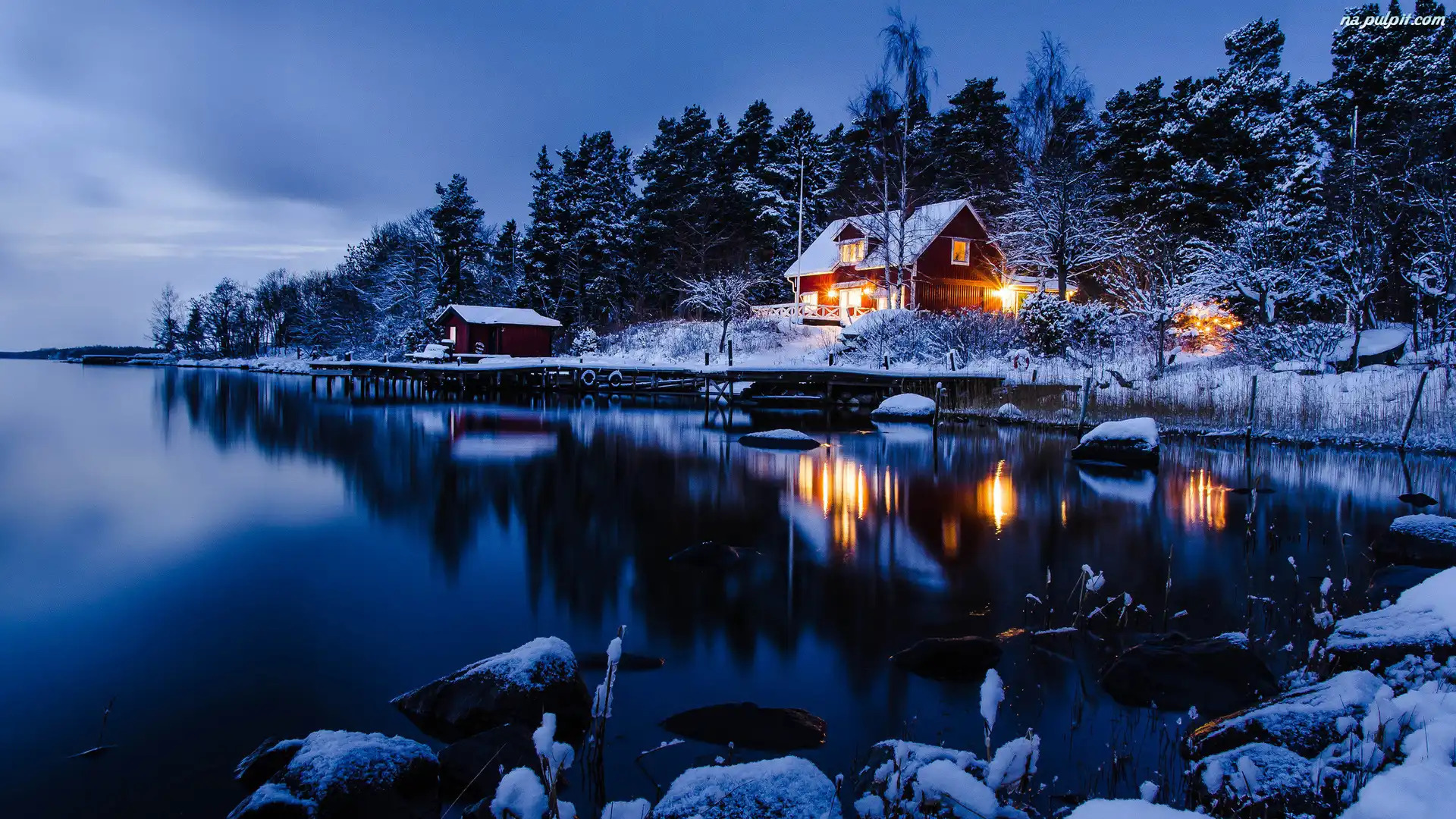 Dom, Jezioro, Zima, Oświetlony Na Pulpit