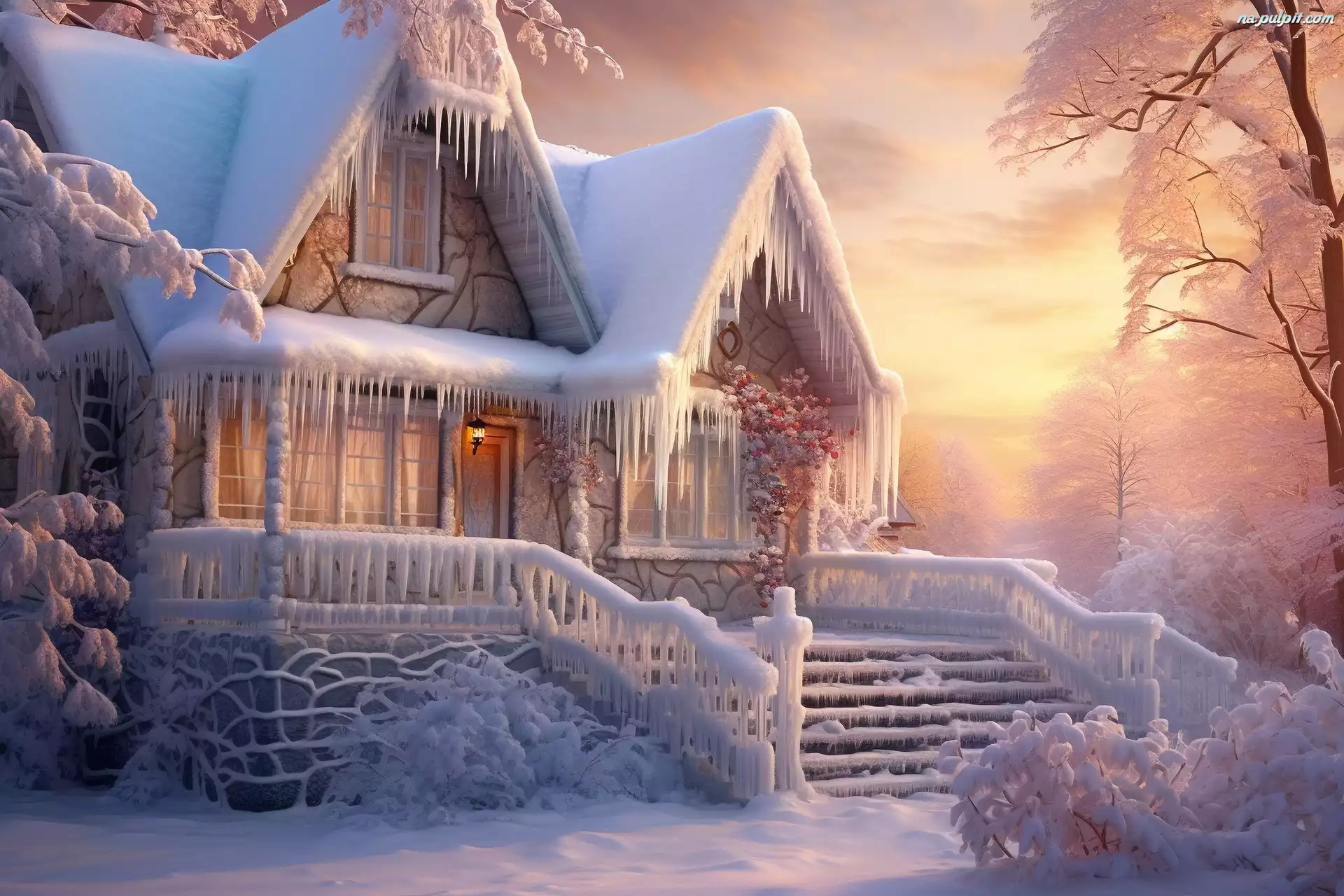 Zachód słońca, Zima, Dom, Sople, Ośnieżony, Grafika Na Pulpit