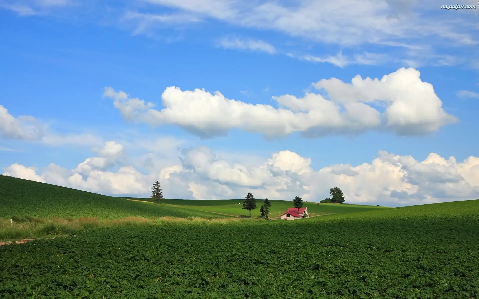 Domek, Pole, Chmury, Drzewa Na Pulpit