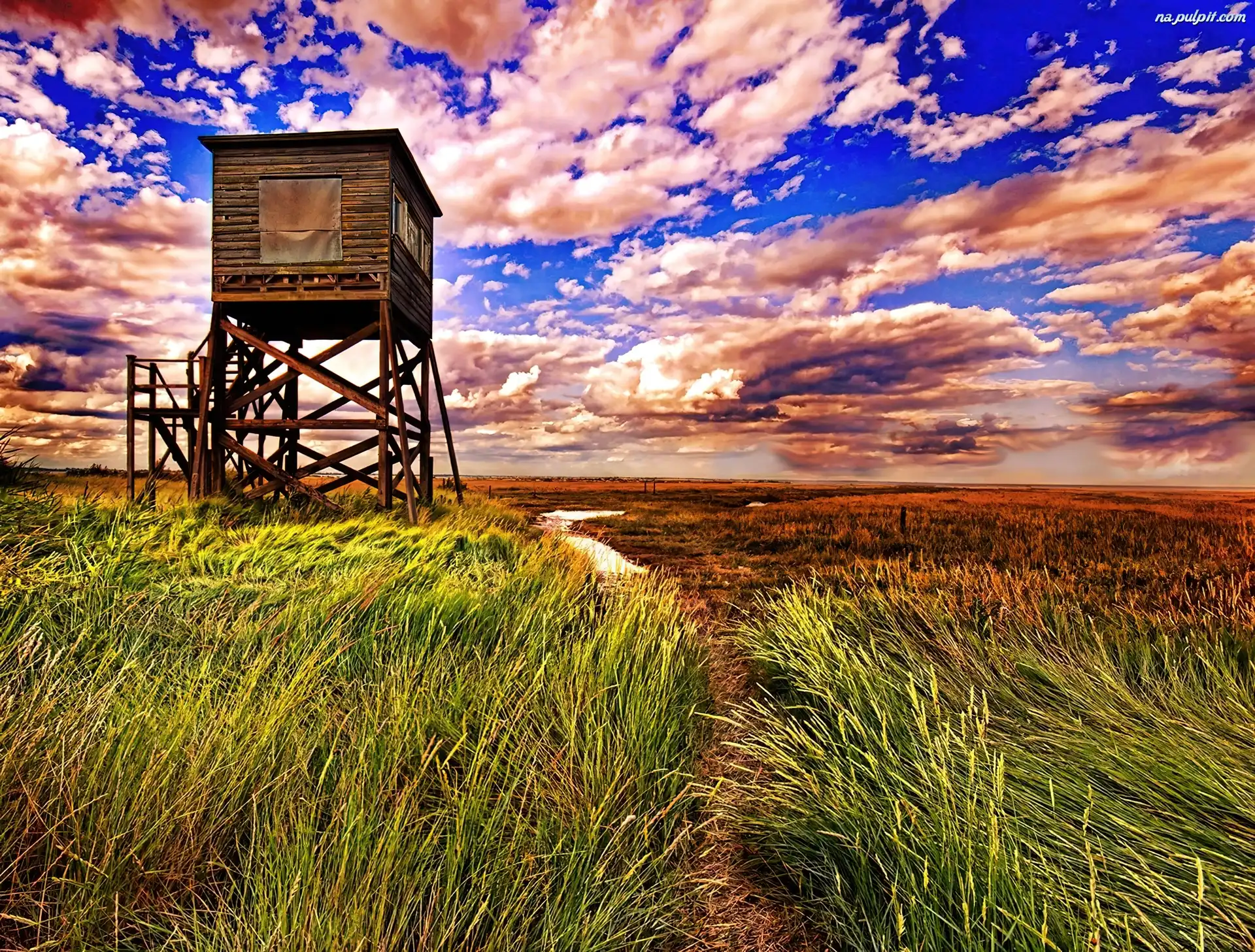 Domek, Słońca, Zachód, Chmury, Trawa Na Pulpit