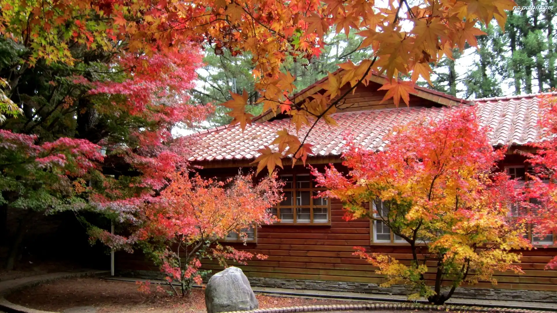 Domek, Liście, Kolorowe, Drzewa, Głaz