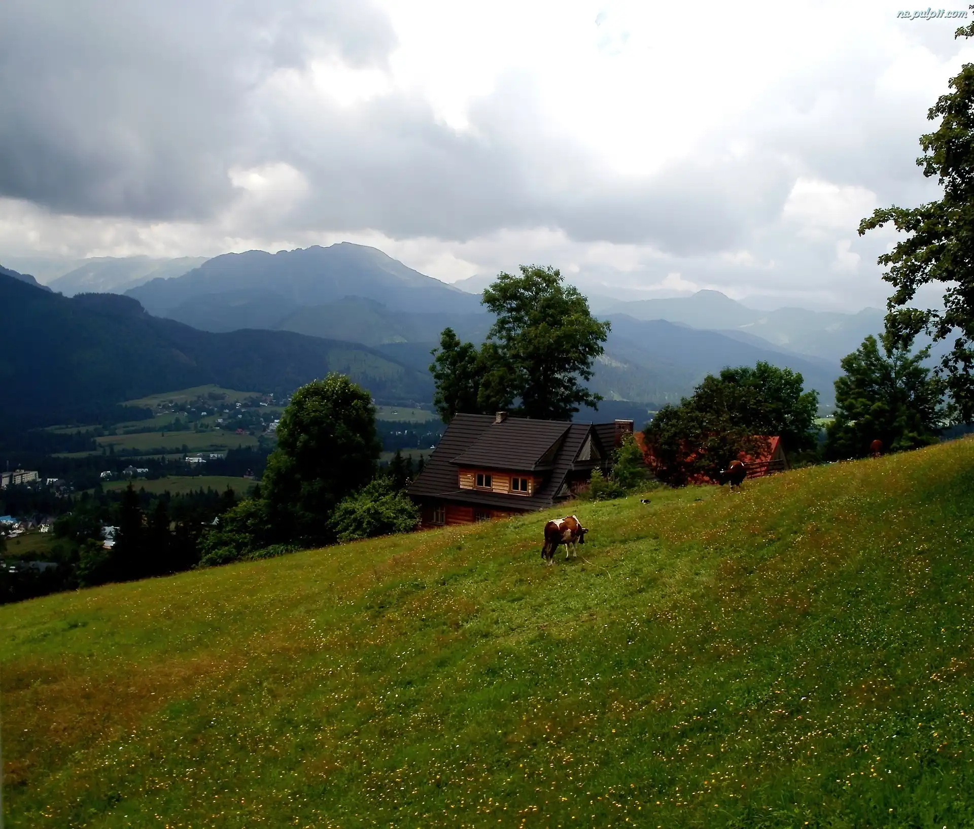Domek, Łąka, Góry, Krowa Na Pulpit