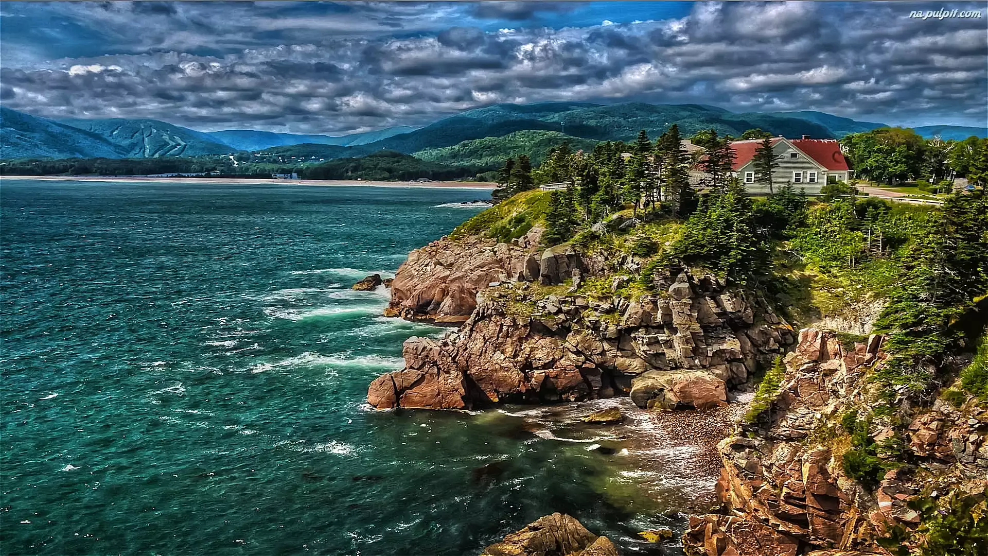 Domek, Morze, Chmury, Góry, Skały Na Pulpit