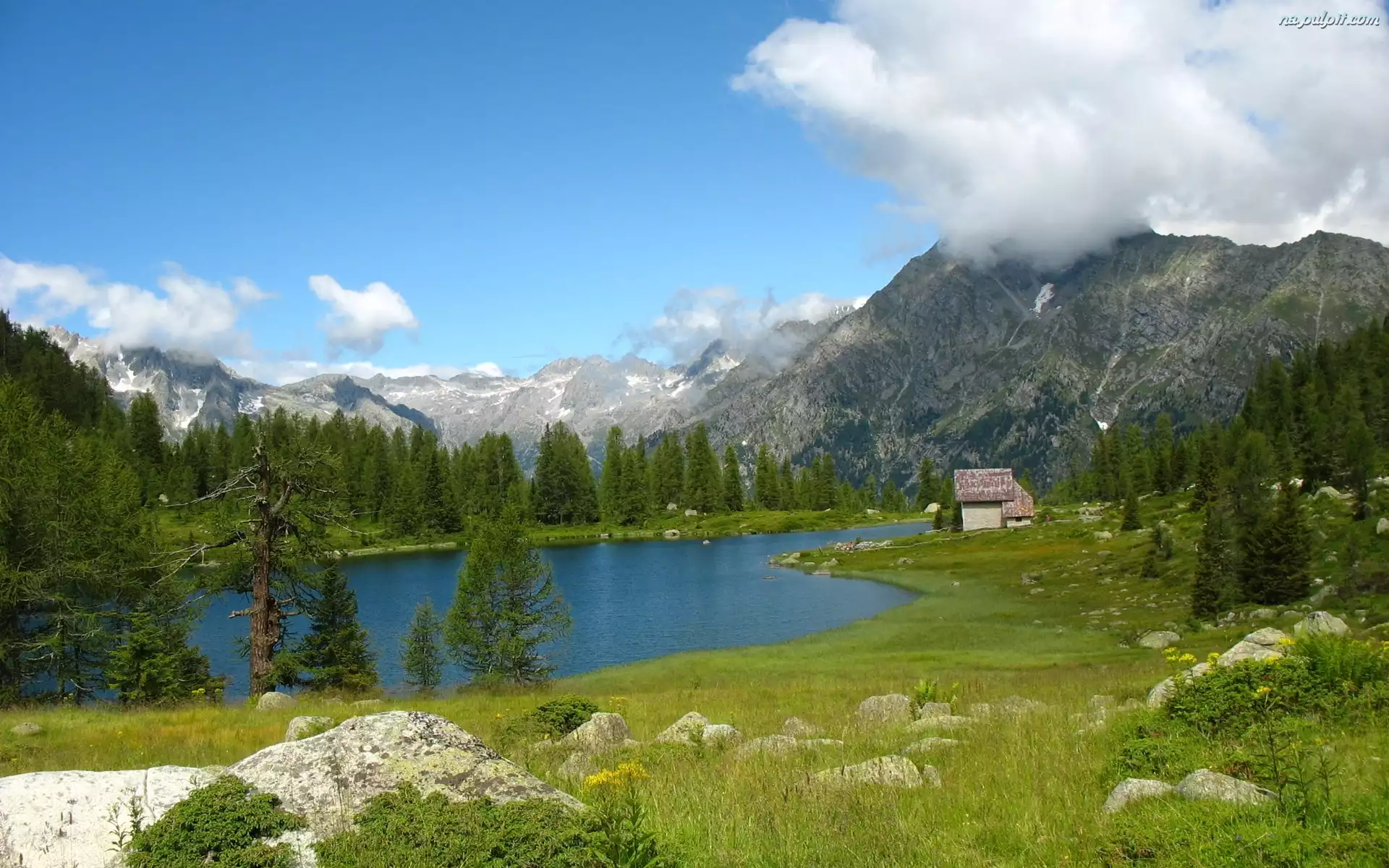 Domek, Lasy, Góry, Rzeka, Chmury Na Pulpit