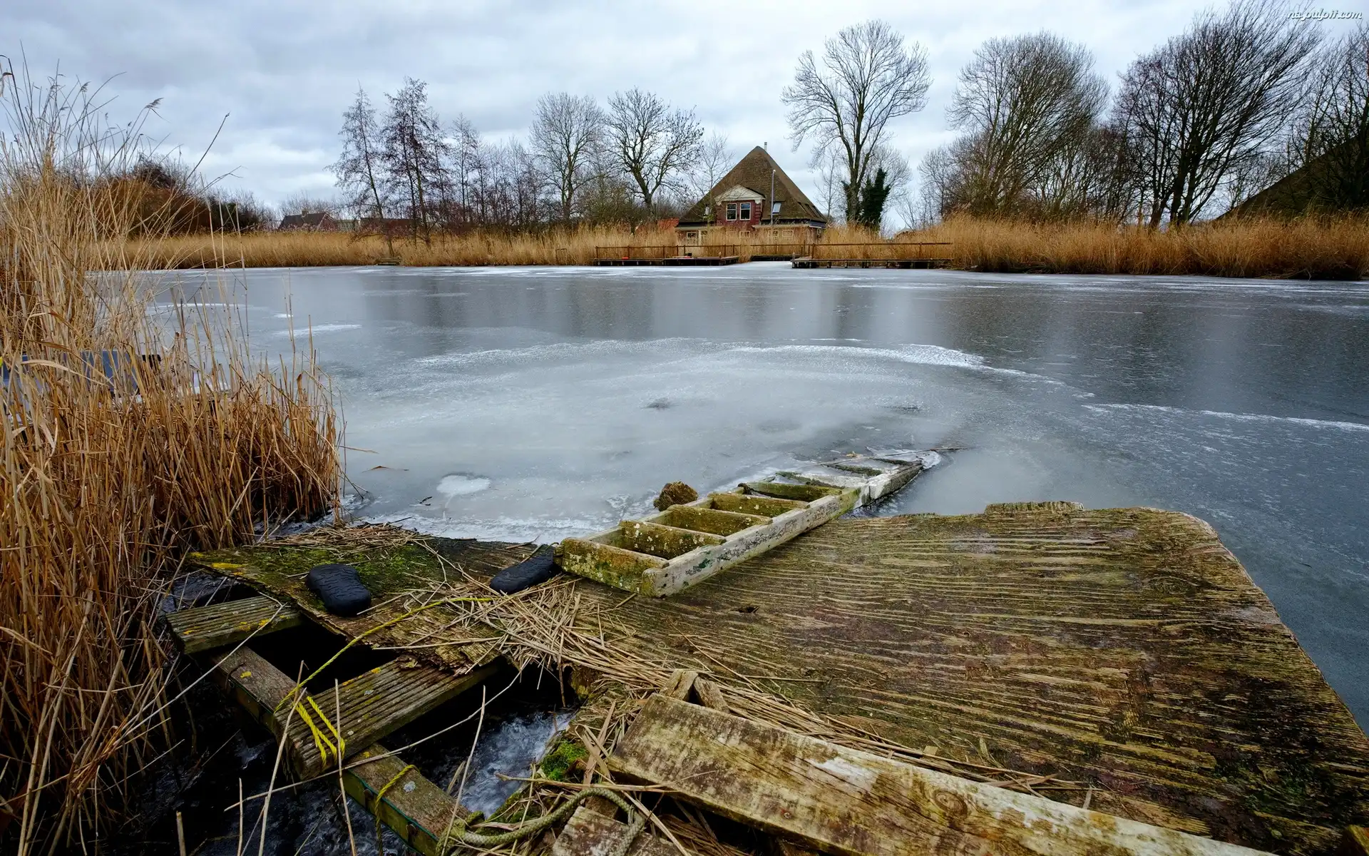 Domek, Szuwary, Rzeka, Drzewa Na Pulpit