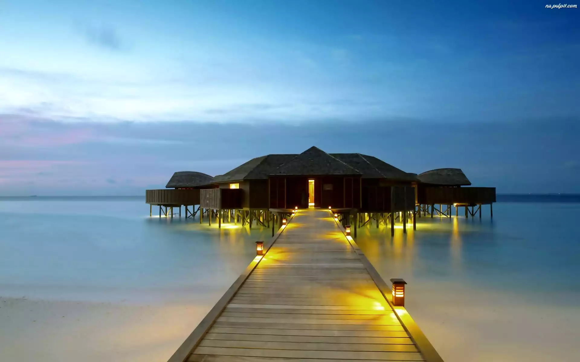 Laguna, Domki, Na Palach, Podświetlone, Wieczór, Molo