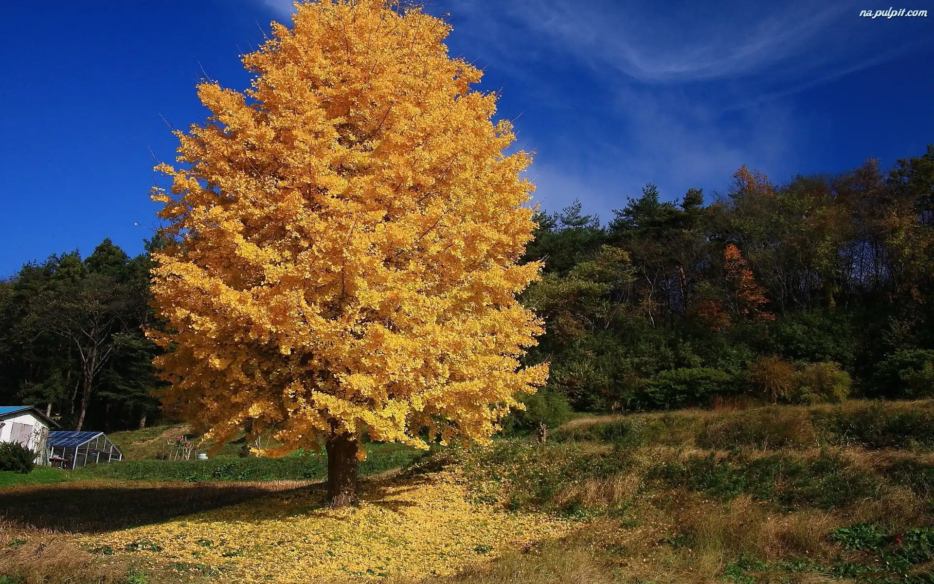 Domki, Drzewo, Las, Trawy Na Pulpit