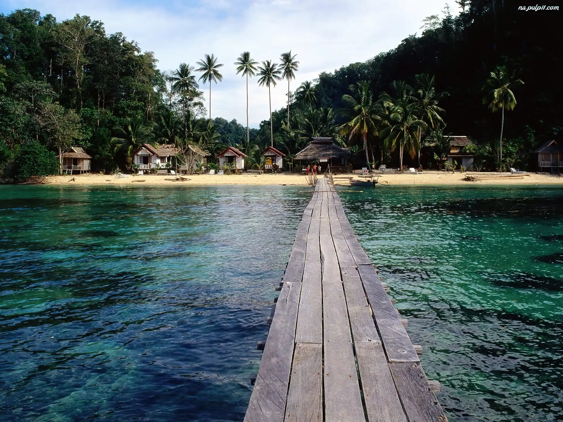 Domki, Plaża, Morze, Molo, Palmy Na Pulpit