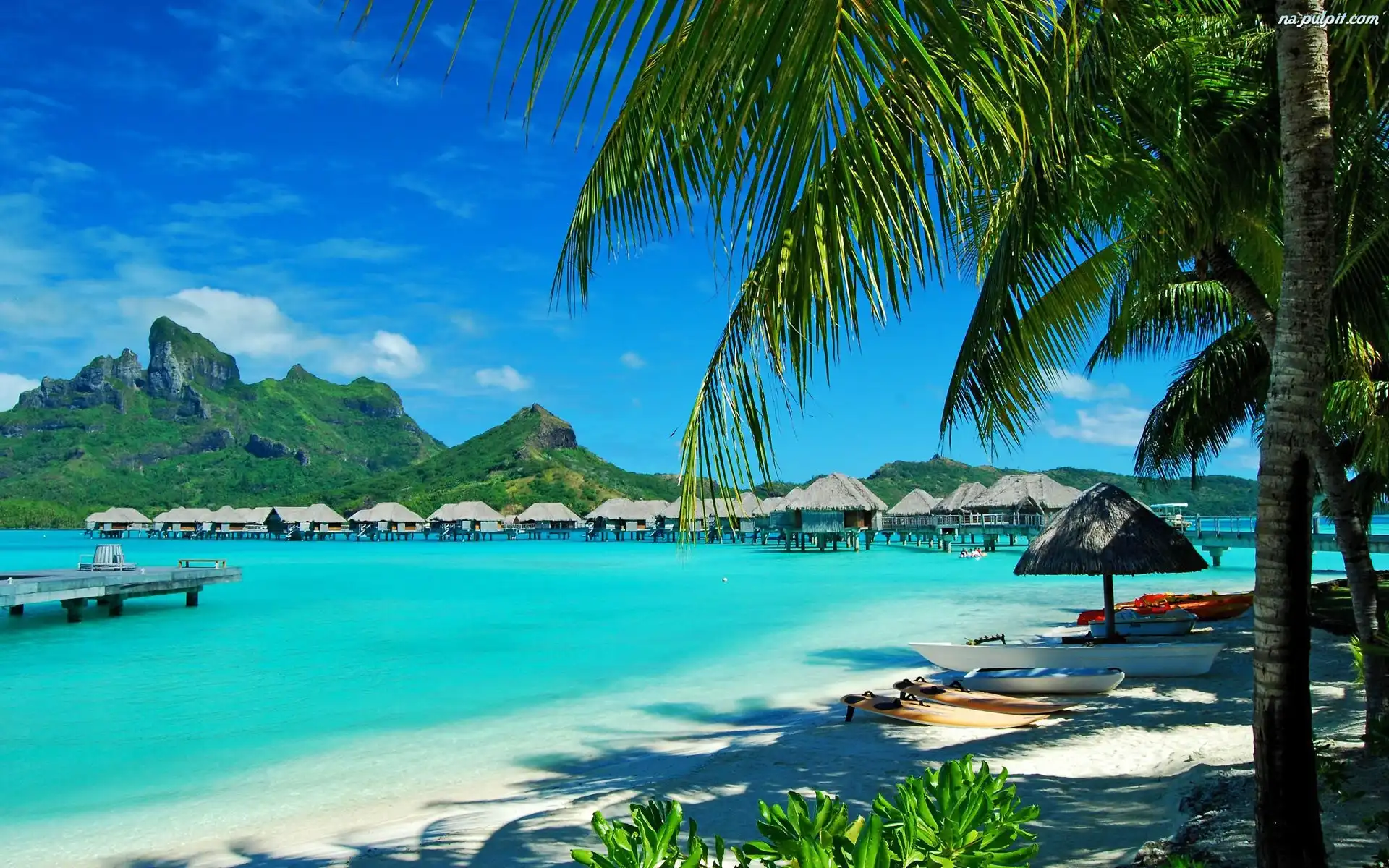 Domki, Palmy, Góry, Morze, Plaże Na Pulpit