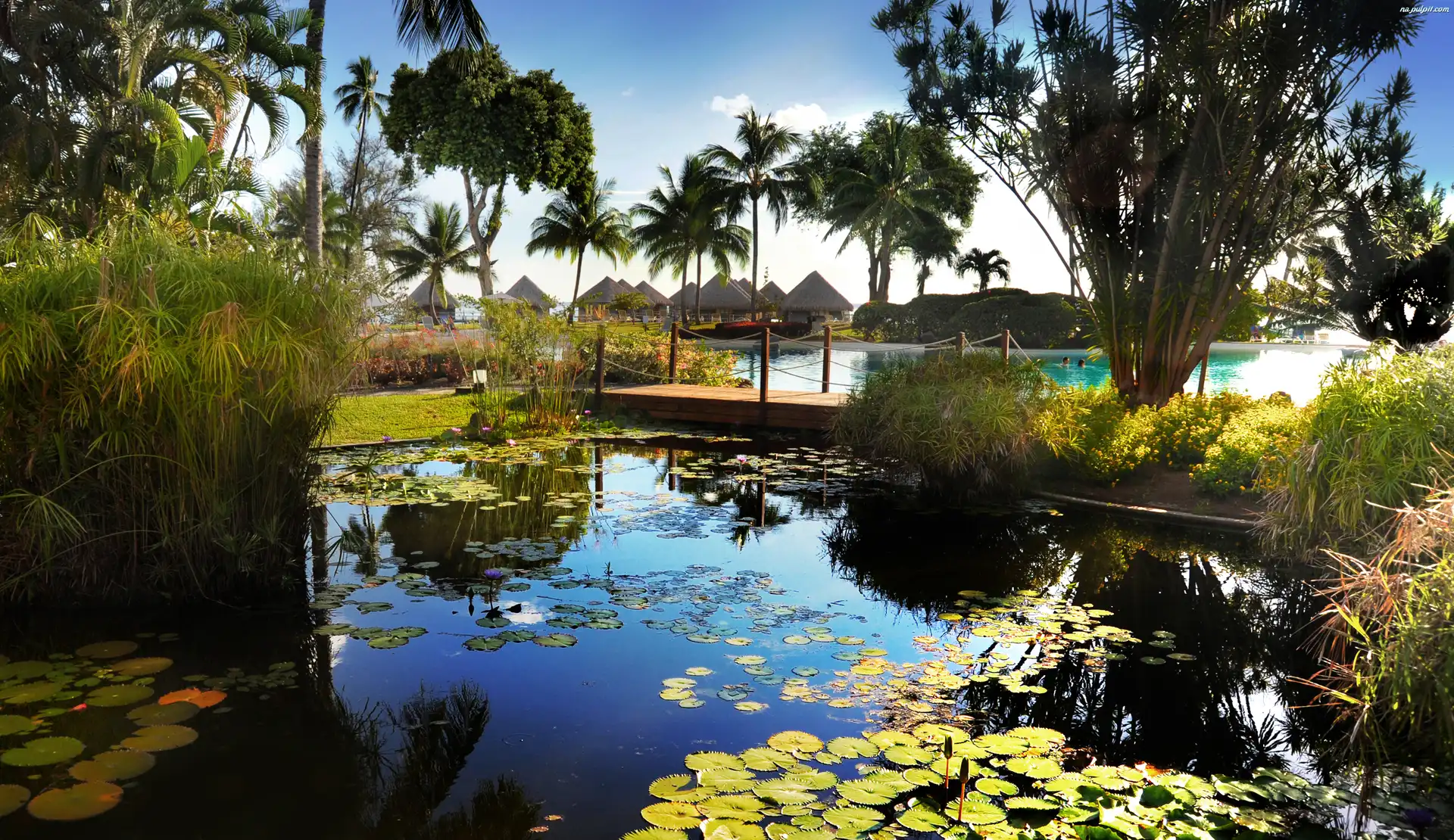 Domki, Staw, Ogród, Palmy