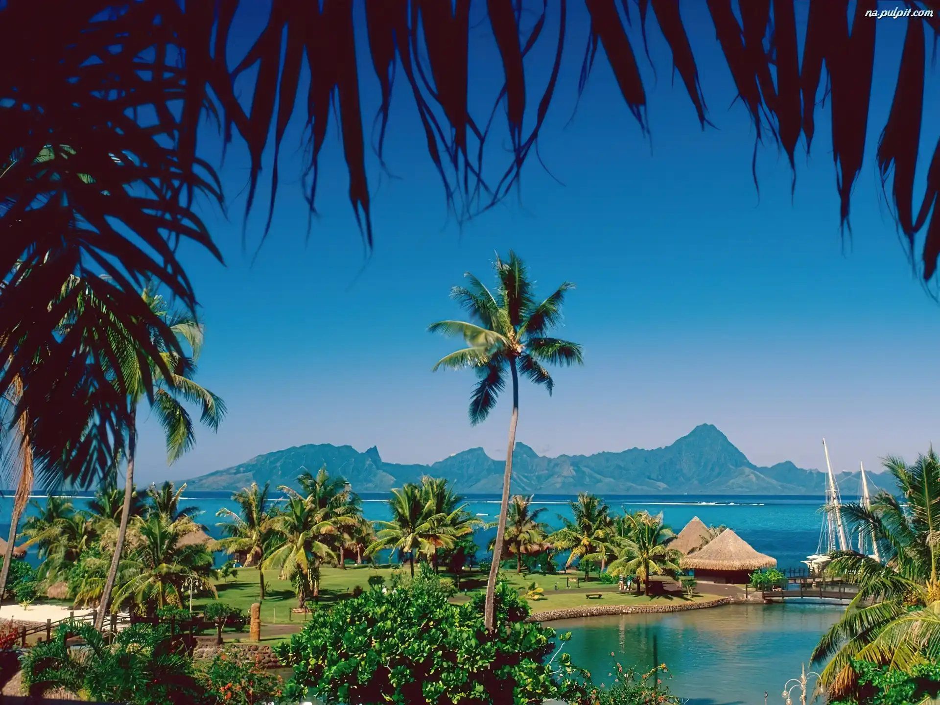 Domki, Palmy, Woda, Niebo Na Pulpit
